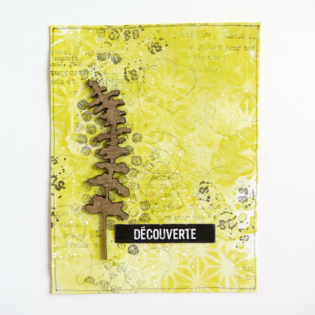 Côté technique : un papier de vieux livre en fond, le tout recouvert de gesso. Puis de l'encre de chine noire en bas et des brushos (Lime Green et Turquoise) en haut.